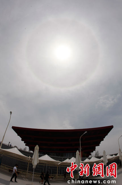 2010年5月4日,上海世博園區(qū)上空出現(xiàn)日暈,與中國國家館和尼泊爾館相映成趣。中新社發(fā) 盛佳鵬 攝
