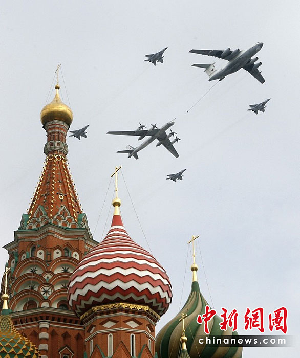 當(dāng)?shù)貢r(shí)間5月4日,在俄羅斯首都莫斯科,參加彩排的戰(zhàn)機(jī)編隊(duì)飛過(guò)紅場(chǎng)上空。俄羅斯將于5月9日隆重紀(jì)念衛(wèi)國(guó)戰(zhàn)爭(zhēng)勝利65周年。圖片來(lái)源:中國(guó)新聞網(wǎng)