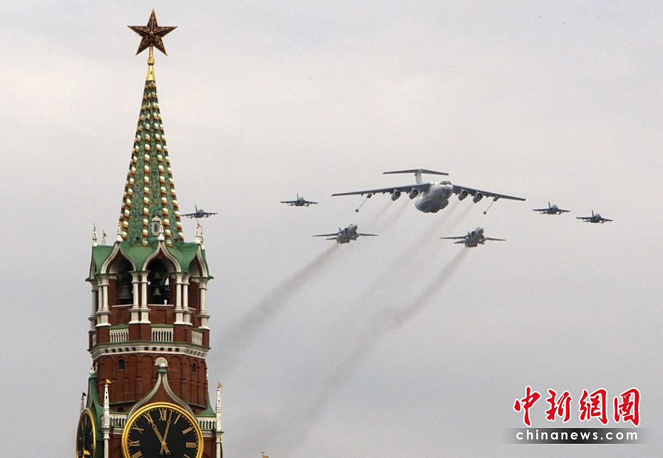 當?shù)貢r間5月4日,在俄羅斯首都莫斯科,參加彩排的戰(zhàn)機編隊飛過紅場上空。俄羅斯將于5月9日隆重紀念衛(wèi)國戰(zhàn)爭勝利65周年。圖片來源:中國新聞網(wǎng)