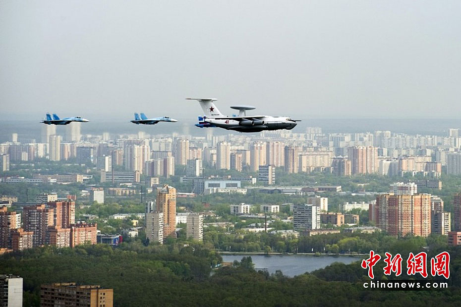 當(dāng)?shù)貢r間5月4日,在俄羅斯首都莫斯科,參加彩排的戰(zhàn)機編隊飛過紅場上空。俄羅斯將于5月9日隆重紀念衛(wèi)國戰(zhàn)爭勝利65周年。圖片來源:中國新聞網(wǎng)