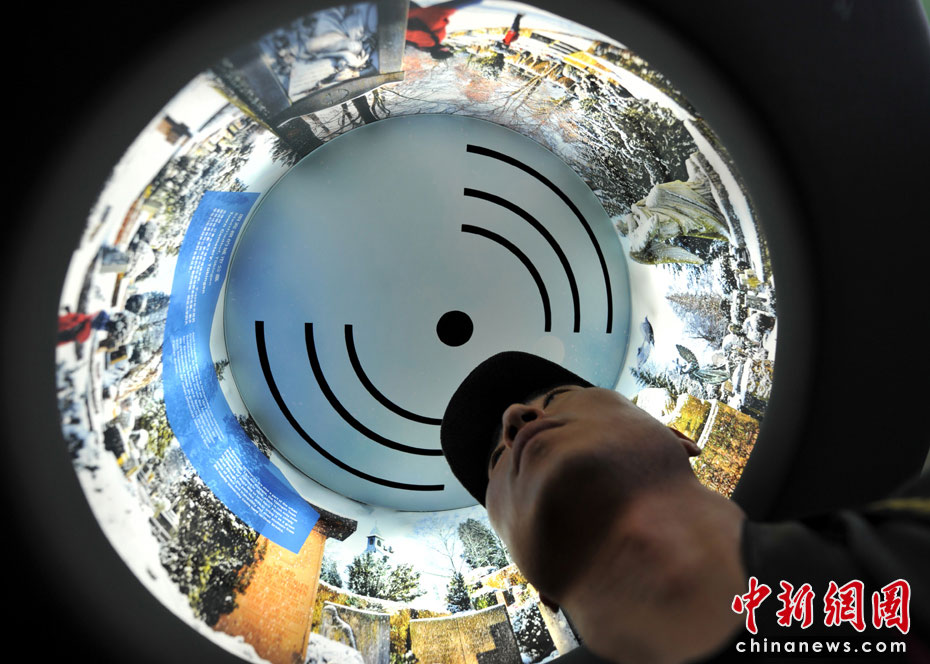 360度環(huán)繞視聽(tīng)體驗(yàn),像個(gè)燈罩一樣,游客可以把頭伸進(jìn)去,聲音效果的確不錯(cuò)。中新網(wǎng)記者 王紅綱 攝