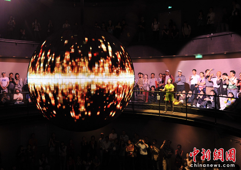 德國館的高潮就是它的最后部分“動(dòng)力之源”?梢匀菁{600人的動(dòng)力之源大廳圓形環(huán)廊是一個(gè)圓錐形空間,中間懸掛著一個(gè)重達(dá)1.5噸、直徑達(dá)3米的巨大金屬球,四周則有一圈供游客駐足的走廊。黑漆漆的大廳里,兩個(gè)虛擬主持人邀請(qǐng)觀眾同時(shí)大聲吶喊。隨著吶喊聲的加大,動(dòng)力球慢慢擺動(dòng)起來,聲音越大擺動(dòng)幅度越大,甚至繞圈飛行。圓球表面40萬根發(fā)光的LED管,逐漸閃現(xiàn)出德國人對(duì)未來城市生活的暢想畫面。這是一場7分鐘的互動(dòng)體驗(yàn)。在這里觀眾才是主角。中新網(wǎng)記者 王紅綱 攝