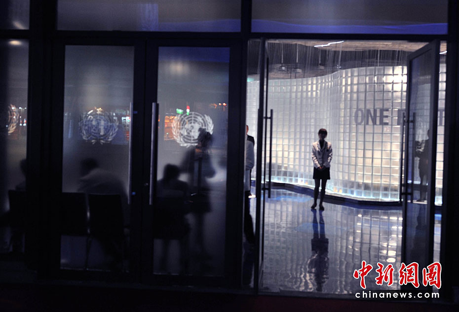 一所藍色的簡樸平房,在5月開園的上海世博會大道邊上,極不顯眼。但是,聯(lián)合國聯(lián)合館的鮮明會標,特別吸引人。這個展館集中了世界衛(wèi)生組織、世界銀行和聯(lián)合國的兒童基金會、糧農(nóng)組織、教科文組織等22個機構。圖片來源:中國新聞網(wǎng) 賈國榮 攝