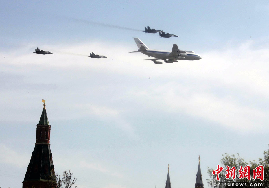 5月9日,俄羅斯在莫斯科紅場舉行盛大的閱兵式,慶祝衛(wèi)國戰(zhàn)爭勝利65周年。莫斯科時(shí)間5月9日上午10點(diǎn)(北京時(shí)間9日下午2點(diǎn))許,閱兵式正式開始。圖為空中梯隊(duì)飛越紅場上空。中新網(wǎng)記者 張朔 攝