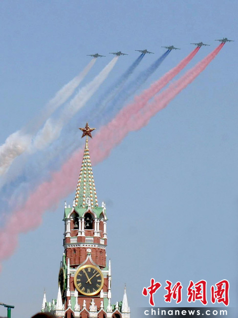5月9日,俄羅斯在莫斯科紅場舉行盛大的閱兵式,慶祝衛(wèi)國戰(zhàn)爭勝利65周年。莫斯科時間5月9日上午10點(北京時間9日下午2點)許,閱兵式正式開始。6架蘇-25強擊機在紅場上空噴出象征俄羅斯國旗白、藍、紅三色的煙霧。中新社發(fā) 田冰 攝
