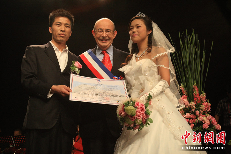 5月11日,35對新人來到世博法國館內(nèi)舉行婚禮儀式。法國館舉行“法蘭西浪漫婚典”的集體婚禮。圖為法國圖爾市長為參與此婚典的新人頒發(fā)“證書”。中新社發(fā) 潘索菲 攝
