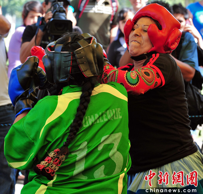5月13日,秘魯利馬高地舉辦的傳統(tǒng)食品博覽會上,兩名安第斯農(nóng)民婦女穿著象征秘魯和玻利維亞的裙子同臺搏擊妙趣橫生。圖片來源:中國新聞網(wǎng)