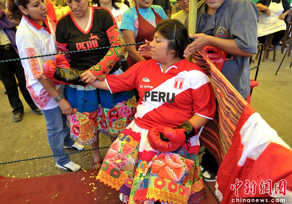5月13日,秘魯利馬高地舉辦的傳統(tǒng)食品博覽會上,兩名安第斯農民婦女穿著象征秘魯和玻利維亞的裙子同臺搏擊妙趣橫生。圖片來源:中國新聞網