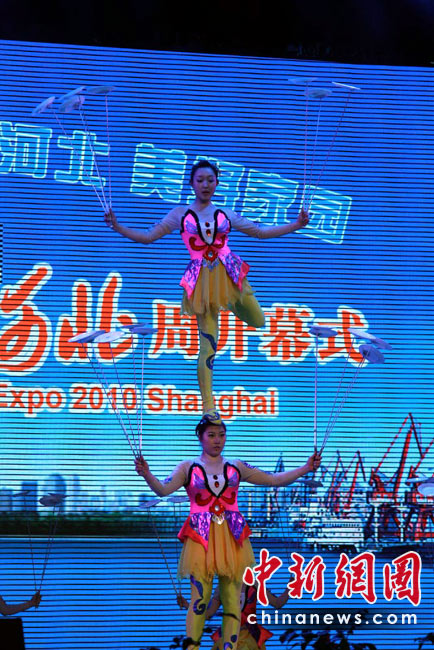 5月14日,上海世博會“河北活動周”在寶鋼大舞臺啟幕,戰(zhàn)鼓、旱船、拉花、草編、石雕、年畫、雜技、皮影戲……燕趙大地的傳統(tǒng)絕活一一登場!昂颖被顒又堋弊14日持續(xù)至18日,將圍繞“京畿神韻”的主線,向世界展示河北省的經濟和藝術魅力,是繼直轄市北京、天津之后,第一個由省份在世博會上舉辦的活動周。中新社記者 殷春永 攝