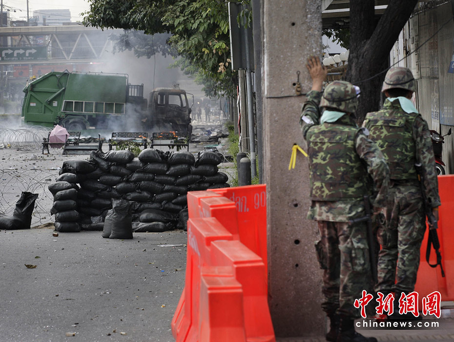 泰國政府軍和反政府示威者5月14日深夜在曼谷爆發(fā)嚴(yán)重暴力沖突。曼谷緊急醫(yī)療機構(gòu)15日稱,截止當(dāng)?shù)貢r間早晨6時,沖突已導(dǎo)致16人死亡,至少141受傷,傷者中包括3名外國人。圖片來源:中國新聞網(wǎng)