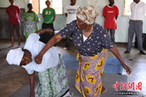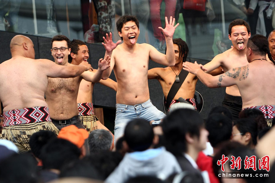 5月初,游客在上海世博會(huì)新西蘭館前赤膊上陣學(xué)跳毛利舞。中新社記者 杜洋 攝