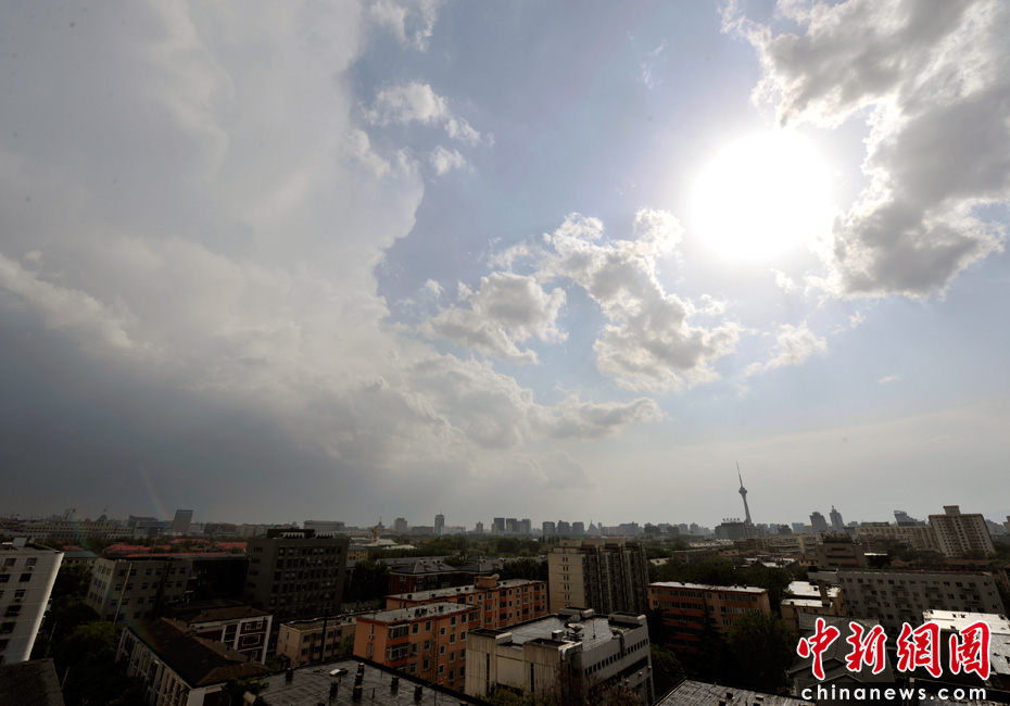 5月18日16時許,伴隨陣陣?yán)茁暰┏峭唤荡笥,降雨過后東部天空依然籠罩著烏云,而西邊卻已放晴。中新網(wǎng)記者 金碩 攝