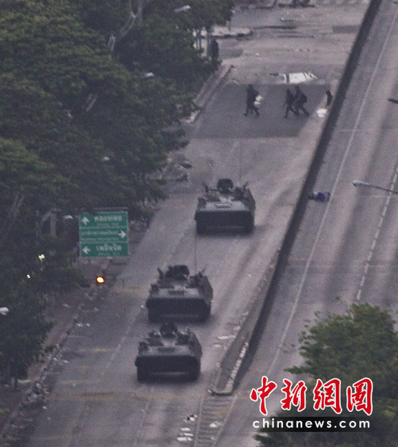 19日清晨,數(shù)百名軍警在武裝車輛的掩護(hù)下向反政府示威者在曼谷的大本營聚集。自上周四紅衫軍與政府在曼谷爆發(fā)沖突以來,已經(jīng)導(dǎo)致39人死亡,數(shù)百人受傷。