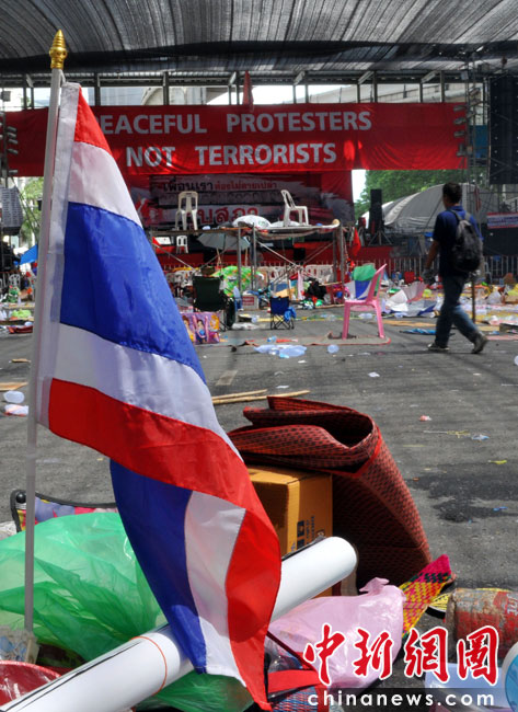 泰國紅衫軍領(lǐng)導人乍都蓬19日下午1時決定,向曼谷警方投降。同時向警方投降的還包括納塔兀、素蓬、翁醫(yī)師等紅衫軍核心領(lǐng)導人。紅衫軍領(lǐng)導人納塔兀責其支持者宣布,結(jié)束紅衫軍已持續(xù)了兩個多月的集會示威行動。圖片來源:中國新聞網(wǎng)