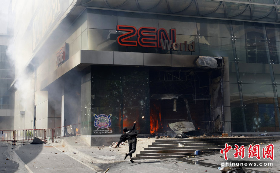 泰國軍方19日清場(chǎng),希望將陷入內(nèi)戰(zhàn)邊緣的曼谷拯救出來,雖然紅衫軍節(jié)節(jié)敗退,但有激進(jìn)分子未肯罷休,四處放火,電視臺(tái)、股票交易所、電力公司、幾間銀行、商場(chǎng)戲院都遭殃,商場(chǎng)和便利店亦成為搶掠目標(biāo)。據(jù)報(bào)曼谷有27處地方起火,泰國最大的商場(chǎng)Central World、Siam Square和Siam Paragon三大購物中心被縱火,其中Central World燒通頂,據(jù)報(bào)快將倒塌。