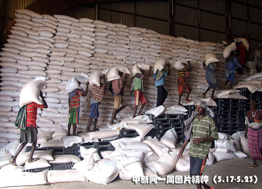 5月19日在索馬里摩加迪沙,工人們?cè)谝婚g倉(cāng)庫(kù)內(nèi)搬運(yùn)玉米。聯(lián)合國(guó)世界糧食計(jì)劃署的糧食供給將發(fā)放到那些貧困以及在國(guó)內(nèi)流離失所的人手中。