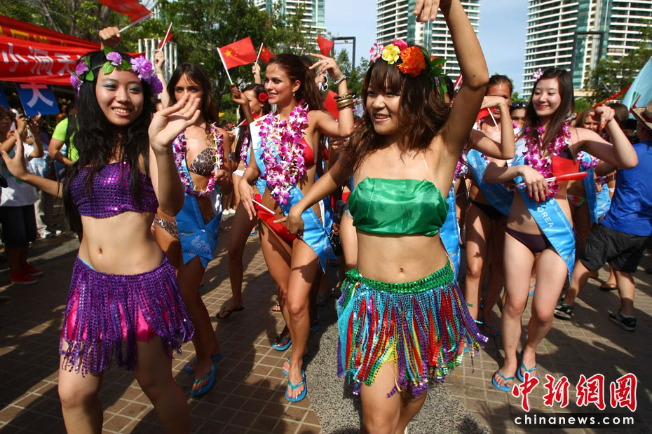 5月23日,全球64位比基尼佳麗們參加了三亞“清涼一夏 文化三亞”夏季旅游促銷活動的啟動儀式及系列主題活動,與三亞市民和游客親密接觸,跳起了歡快的竹竿舞,并乘豪華游艇暢游三亞。中新社記者 富田 攝