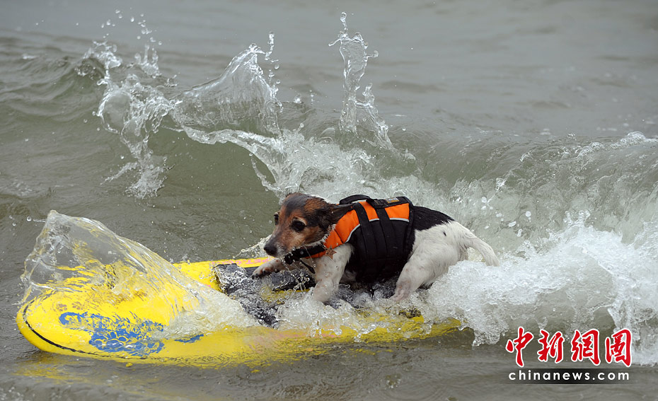 5月22日,美國加利福尼亞州圣迭戈舉行了一場妙趣橫生的狗狗沖浪比賽。圖片來源:中國新聞網