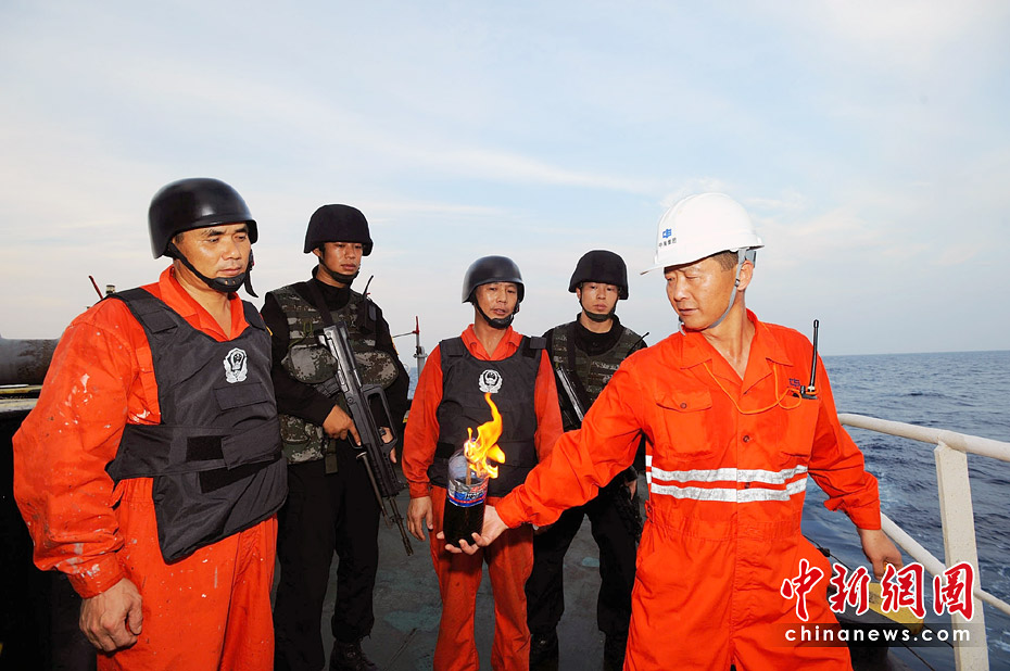 船員在特戰(zhàn)隊(duì)員的指導(dǎo)下,進(jìn)行自制燃燒彈的投擲訓(xùn)練。江山 攝