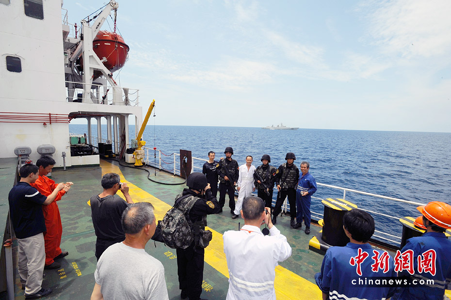 離別時,船員紛紛與特戰(zhàn)隊員以“廣州”艦為背景合影留念,以此表達對護航官兵的敬意和作為中國船員的自豪感。江山 攝