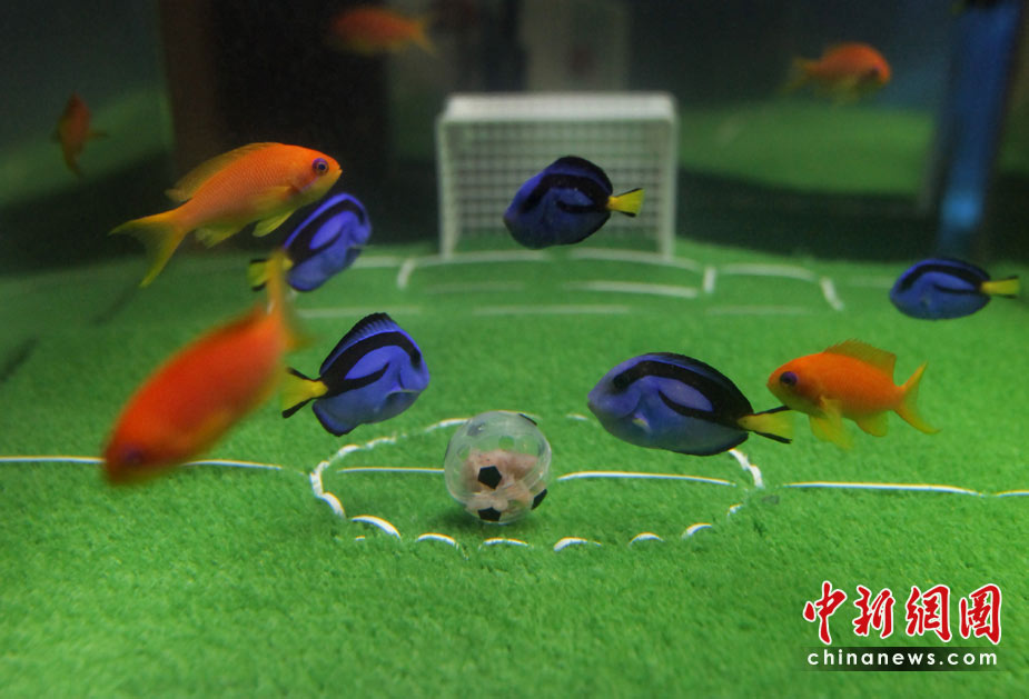 5月23日,日本橫濱八景島海洋世界水族館中,一群魚兒在“踢足球”,藍色魚代表日本隊,橘色魚代表荷蘭隊。在2010年南非“世界杯”上,日本將迎戰(zhàn)荷蘭隊。