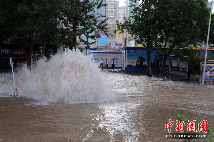 2010年5月25日下午4點(diǎn)半左右,北京京廣橋附近發(fā)生水管爆裂,水柱噴射到兩層樓高,流出的水已成河,造成東三環(huán)嚴(yán)重?fù)矶。牛宏?攝(圖片來源:CFP)
