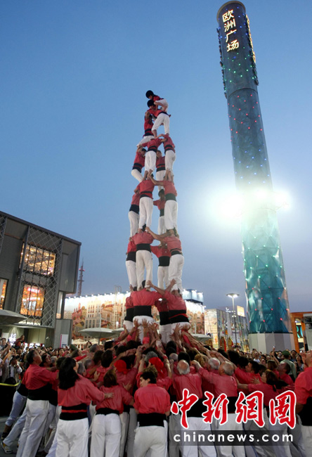 5月25日,西班牙“人塔”在上海世博會(huì)歐洲廣場(chǎng)上逐層壘起,為西班牙加泰羅尼亞周助興!隘B人塔”(HUMAN WALL),是西班牙加泰羅尼亞地區(qū)最具傳統(tǒng)特色的民俗節(jié)慶活動(dòng),起源于18世紀(jì)末加泰羅尼亞南部的巴爾斯。后來(lái),“疊人塔”活動(dòng)逐漸在加泰羅尼亞其他地區(qū)流行,進(jìn)而風(fēng)靡整個(gè)西班牙。中新社發(fā) 杜洋 攝
