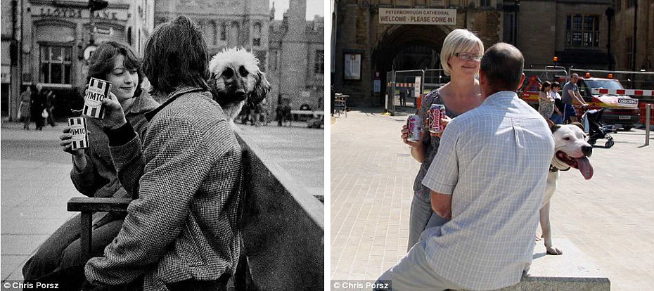 朱迪和戴夫在廣場的長椅上邊小憩邊喝冷飲,當(dāng)時(shí)二人正在慶祝朱迪的21歲生日。30年過去了,他們已經(jīng)是3個(gè)孩子的父母,身邊的寵物狗換了一條,夫妻倆的感情還是那么深厚。