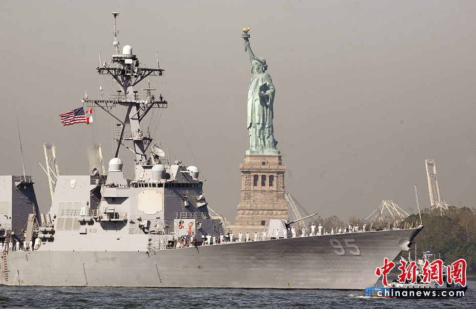 當(dāng)?shù)貢r(shí)間5月26日,美國第23屆紐約艦隊(duì)周開幕,包括“硫磺島”號(hào)兩棲攻擊艦在內(nèi)的11艘參加艦隊(duì)周活動(dòng)的軍艦由南向北在哈得孫河面上游弋。紐約民眾將以?吭诼D哈得孫河86號(hào)碼頭的“無畏號(hào)”航母博物館為中心,展開為期一周的慶祝和紀(jì)念活動(dòng)。圖片來源:中國新聞網(wǎng)