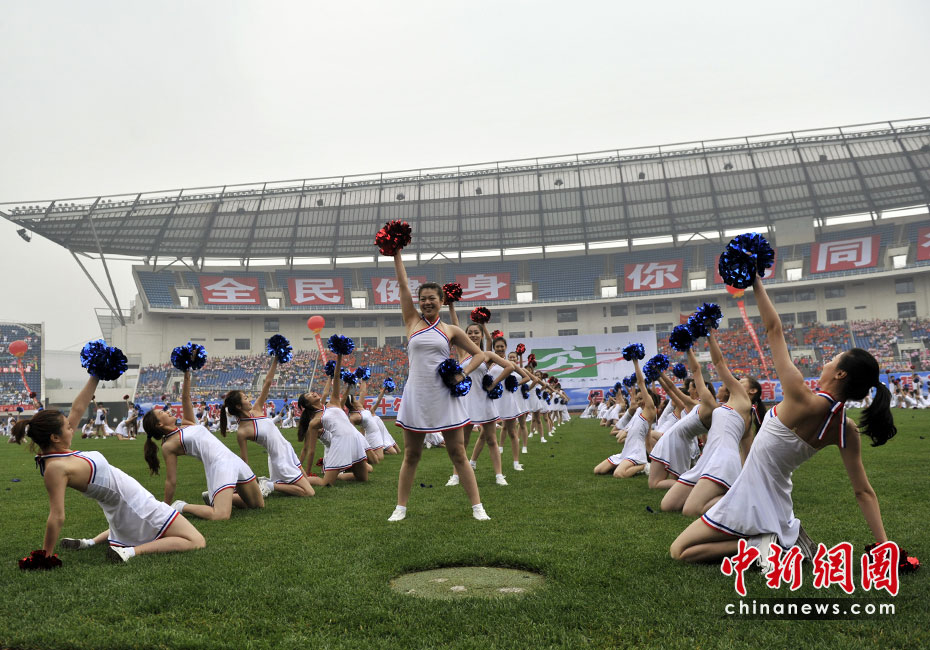 中央國(guó)家機(jī)關(guān)第三屆職工運(yùn)動(dòng)會(huì)今日在北京國(guó)家奧林匹克體育中心正式開幕。90多個(gè)中央國(guó)家機(jī)關(guān)部門參加開幕式,中共中央政治局常委、國(guó)務(wù)院副總理李克強(qiáng)出席活動(dòng)。圖為開幕式上的健身操表演。中新網(wǎng)記者 金碩 攝