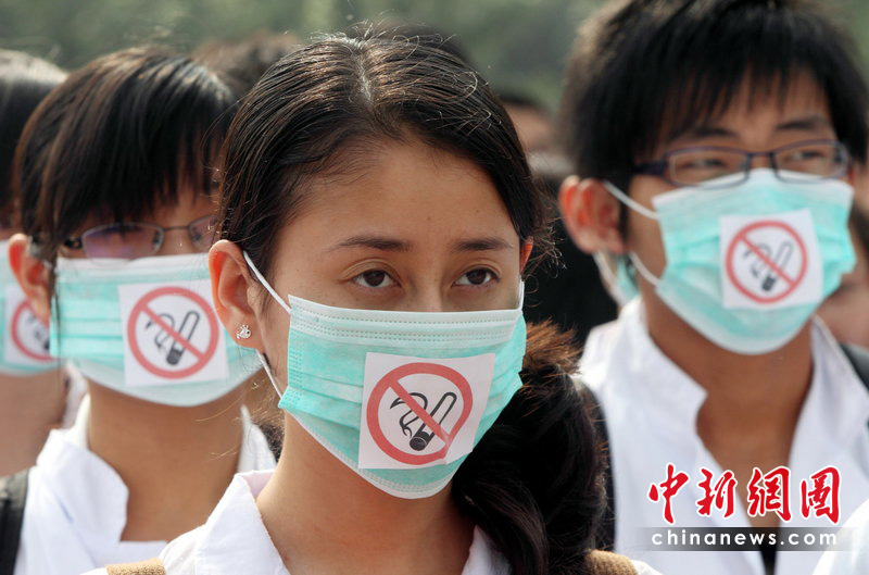 5月31日是第23個(gè)“世界無煙日”,今年的主題是:性別與煙草——抵制針對(duì)女性的市場營銷。吸煙有害健康早已成為不爭的事實(shí)。有關(guān)醫(yī)學(xué)研究表明,吸煙可導(dǎo)致心腦血管疾病、癌癥、慢性阻塞性肺病等多種疾病,已成為繼高血壓之后的全球第二號(hào)殺手。為了您的健康,請(qǐng)熄滅您手中的香煙。圖為5月29日西安大學(xué)生戴著無煙口罩開展控?zé)熜袆?dòng)。袁景智 攝