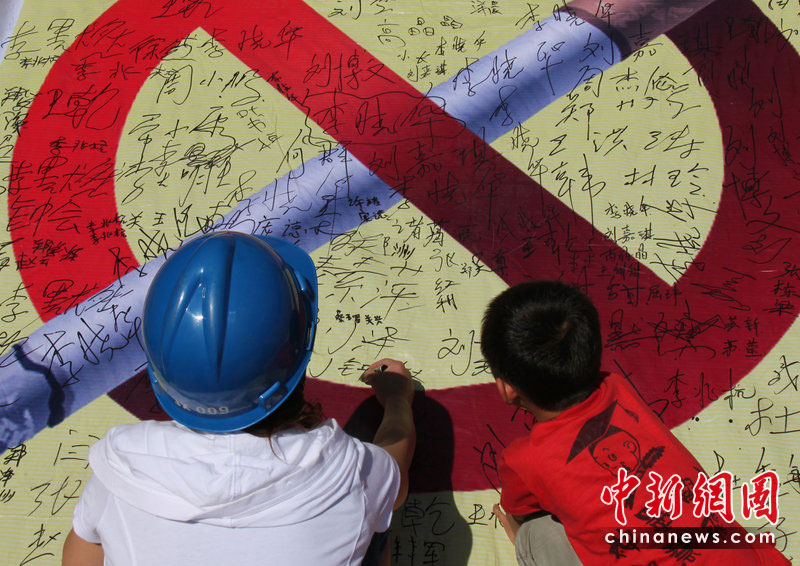 5月31日是第23個“世界無煙日”,今年的主題是:性別與煙草——抵制針對女性的市場營銷。吸煙有害健康早已成為不爭的事實。有關(guān)醫(yī)學(xué)研究表明,吸煙可導(dǎo)致心腦血管疾病、癌癥、慢性阻塞性肺病等多種疾病,已成為繼高血壓之后的全球第二號殺手。為了您的健康,請熄滅您手中的香煙。圖為5月30日,河南省湯陰縣一名女電力工人和孩子一起在禁止吸煙標(biāo)志上簽名,表示要遠(yuǎn)離香煙,自覺加入控?zé)熽犖椤3V姓?攝