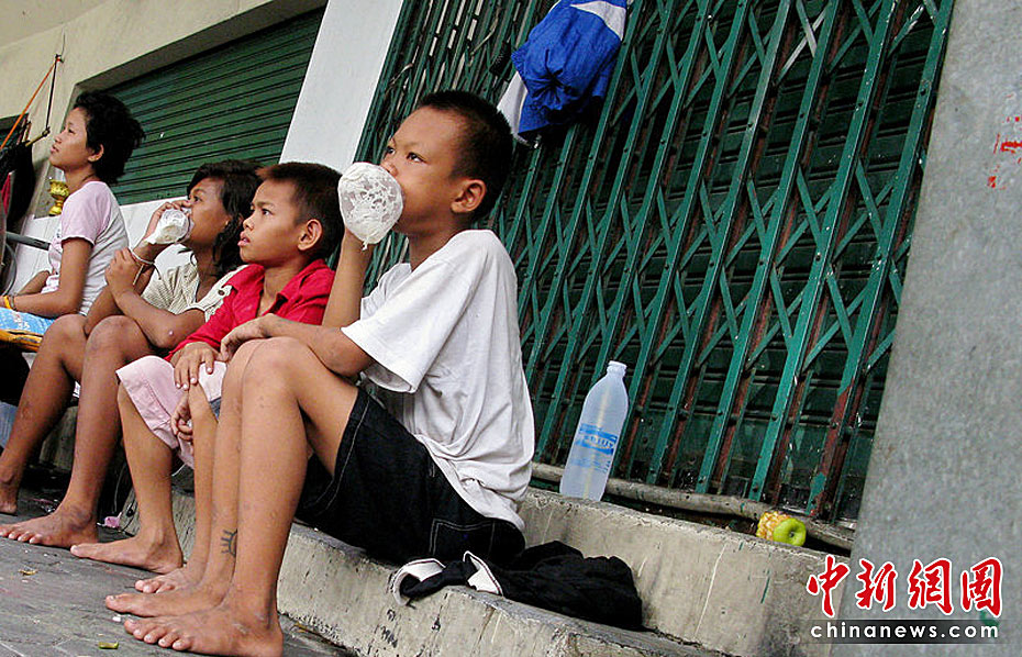 在泰國曼谷街頭,有一群孩子共同生活在Saparn Put(紀念大橋),他們的年齡在5至18歲之間。孩子們靠在寺廟門口賣花賺生活費。圖片來源:CFP