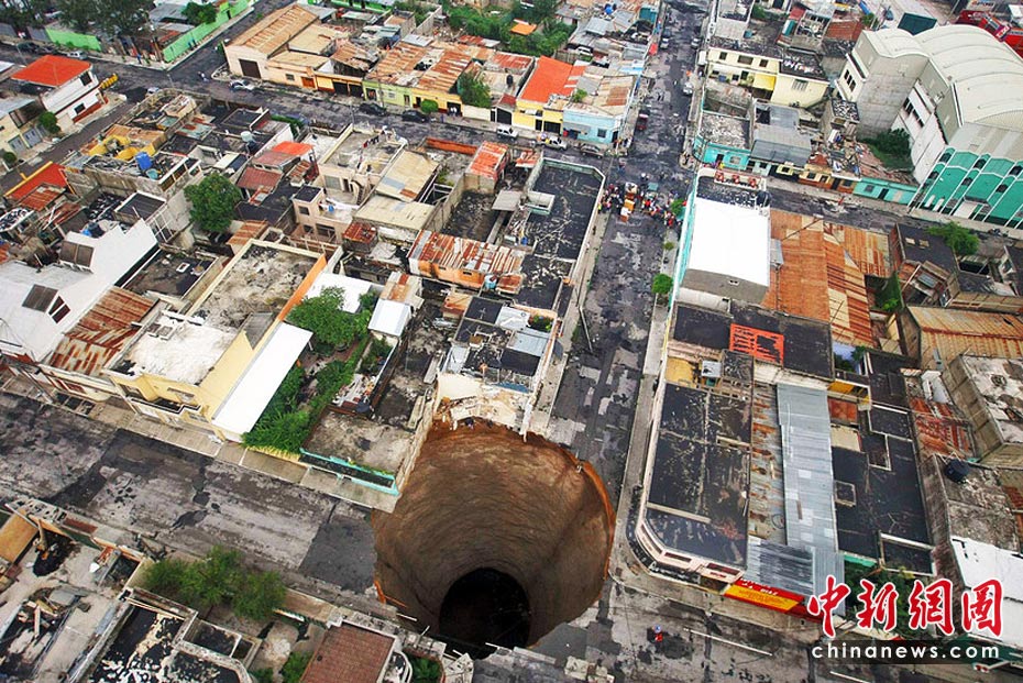 5月31日,受颶風(fēng)“阿加莎”的影響,危地馬拉首都危地馬拉城出現(xiàn)一個(gè)深達(dá)60米塌陷洞,有目擊稱一幢3層建筑墜入洞中,至少造成1人死亡。圖片來源:中國(guó)新聞網(wǎng)