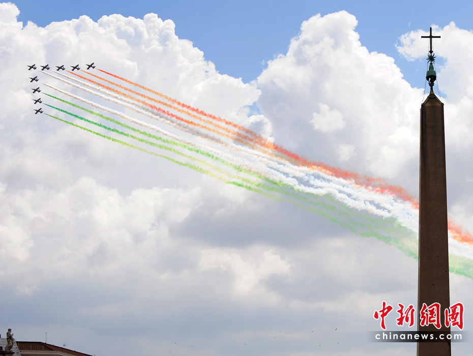 當(dāng)?shù)貢r(shí)間6月2日,意大利首都羅馬舉行盛大儀式慶祝國(guó)慶日。意大利“三色箭”飛行表演隊(duì)在首都上空進(jìn)行了飛行表演。