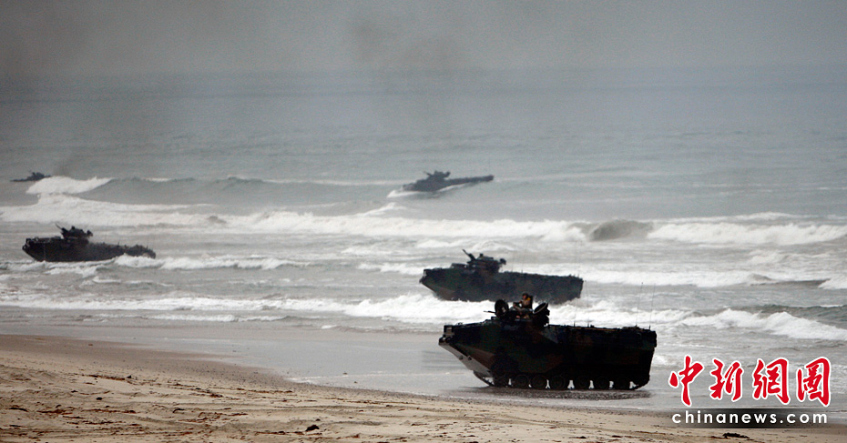 當(dāng)?shù)貢r間6月4日,約5000名水兵和陸戰(zhàn)隊員在美國加利福尼亞州舉行了代號為“黎明突擊”的搶灘登陸軍事演習(xí)。圖片來源:中國新聞網(wǎng)