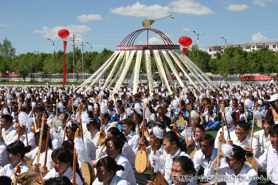 5月30日,新疆托里縣28個民族10495人共同參加冬不拉樂器表演,創(chuàng)下上海吉尼斯世界紀(jì)錄。萬人同奏的哈薩克族樂曲名為《凱乃斯》,漢語意為“和諧”。圖片來源:中國新聞網(wǎng)>>點擊觀看詳細(xì)內(nèi)容