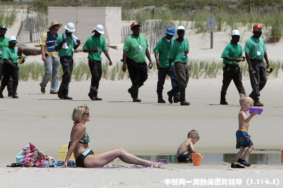 周二(1日),美國(guó)阿拉巴馬州海岸,人們?cè)诤_厱裉?yáng),石油工人在后面走過。墨西哥灣漏油事件已經(jīng)開始影響到該地區(qū)的旅游。