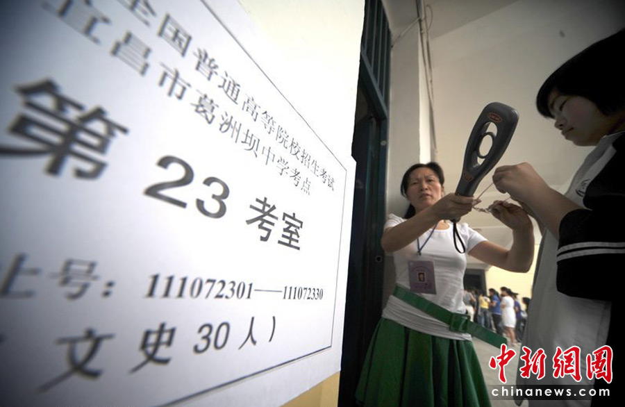 2010年全國高考6月7日日拉開大幕,957萬考生走進(jìn)考場。由于報(bào)名人數(shù)減少,而招生計(jì)劃增加,教育部預(yù)計(jì)今年全國高考平均錄取率將會增加近7%。6月6日下午,參加2010年高考的湖北宜昌考生走進(jìn)葛洲壩中學(xué)考點(diǎn)熟悉考場,進(jìn)場前,監(jiān)考老師手持金屬探測儀器對考生一一進(jìn)行認(rèn)真的安全檢查。劉曙松/CFP