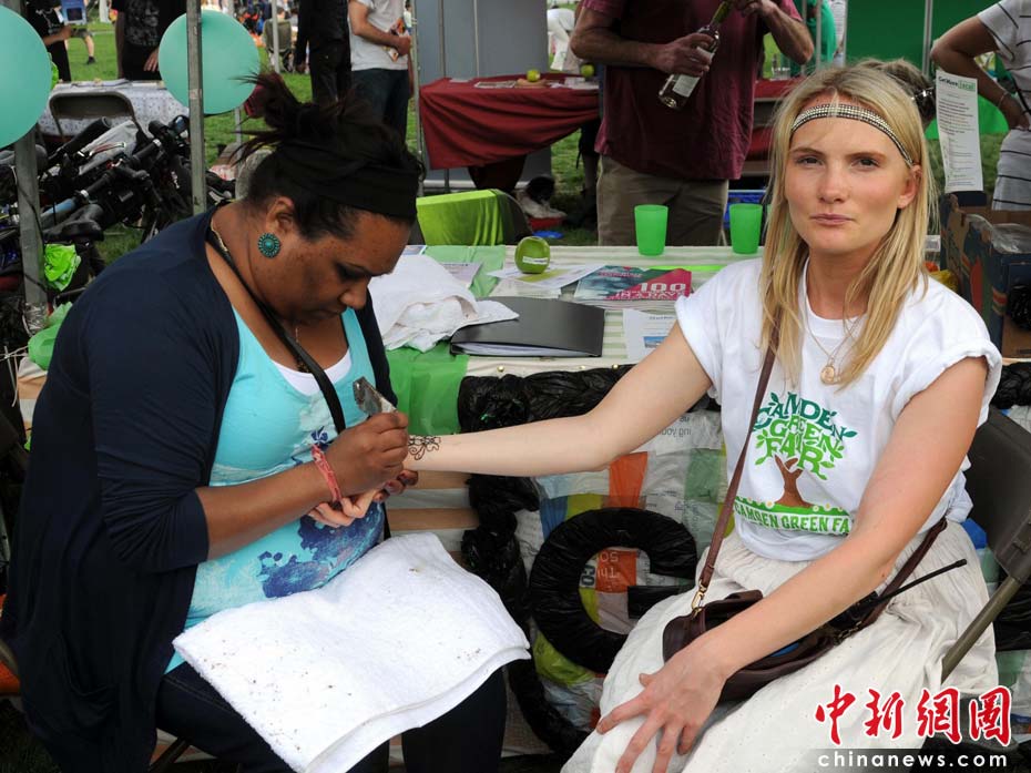 當(dāng)?shù)貢r(shí)間2010年6月6日,英國(guó)倫敦舉行卡姆登綠色市集(Camden Green Fair),這是英國(guó)倫敦每年環(huán)保領(lǐng)域的“重頭戲”。本屆市集的主旨是要喚起大眾對(duì)環(huán)境問(wèn)題的關(guān)注,選擇更加可持續(xù)發(fā)展的生活方式。據(jù)活動(dòng)主辦方預(yù)計(jì),本屆市集將吸引來(lái)自英國(guó)各地和世界各國(guó)的2萬(wàn)多人參加。圖為本次活動(dòng)的組織者Sinclair Eiloart(右)在體驗(yàn)印度手繪藝術(shù)。Fiona/攝 Fiona 馬小剛/文