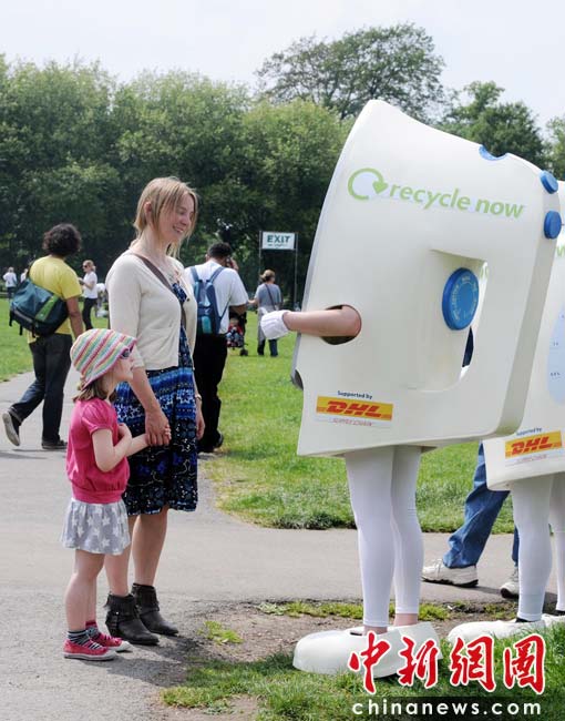 當(dāng)?shù)貢r間2010年6月6日,英國倫敦舉行卡姆登綠色市集(Camden Green Fair),這是英國倫敦每年環(huán)保領(lǐng)域的“重頭戲”。本屆市集的主旨是要喚起大眾對環(huán)境問題的關(guān)注,選擇更加可持續(xù)發(fā)展的生活方式。據(jù)活動主辦方預(yù)計,本屆市集將吸引來自英國各地和世界各國的2萬多人參加。圖為志愿者穿著電水壺模型向游客講解回收廢舊家用電器的重要性,號召人們從節(jié)約資源、防止化學(xué)污染兩方面考慮都要盡量回收廢棄的家用電器。Fiona/攝 Fiona 馬小剛/文