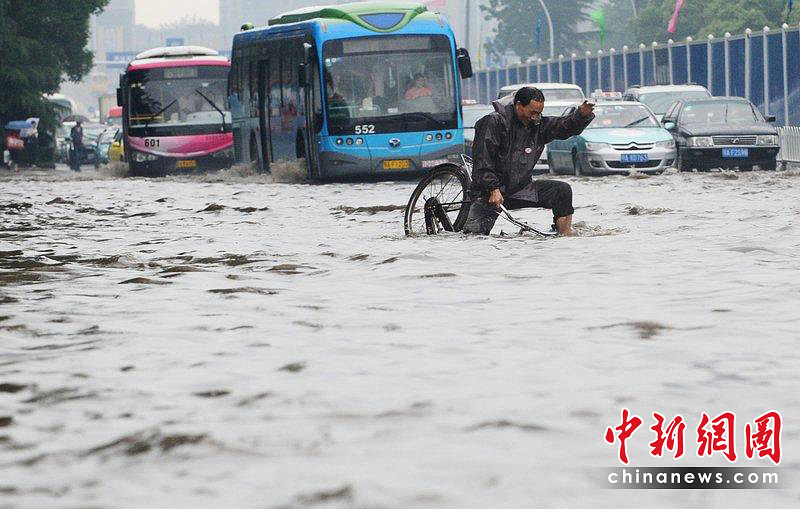 6月8日,武漢持續(xù)降雨,武昌徐東大街汪家墩段,300多米路面積水,最深處超過半米,車輛只得緩慢涉水而行。承影/CFP