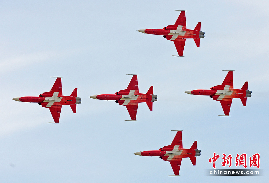2010年柏林國際航空展于當?shù)貢r間6月8日在德國柏林舍內費爾德機場開幕。9日,瑞士飛行表演隊在航展上演了精彩的飛行表演。圖片來源:中國新聞網