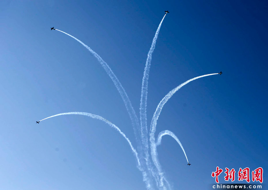 當(dāng)?shù)貢r間6月9日,南非約翰內(nèi)斯堡足球城,飛行表演隊(duì)在進(jìn)行演練。中新社發(fā) 廖攀 攝