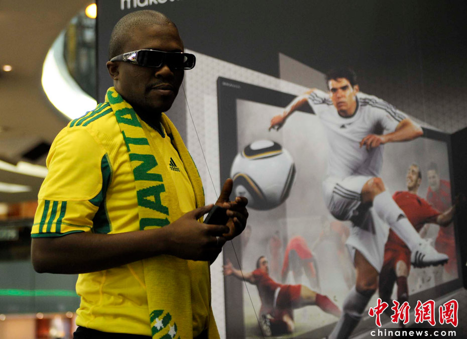 當(dāng)?shù)貢r(shí)間6月9日,一位南非民眾在約翰內(nèi)斯堡的一家商場里體驗(yàn)3D電視觀看足球比賽。中新社發(fā) 廖攀 攝