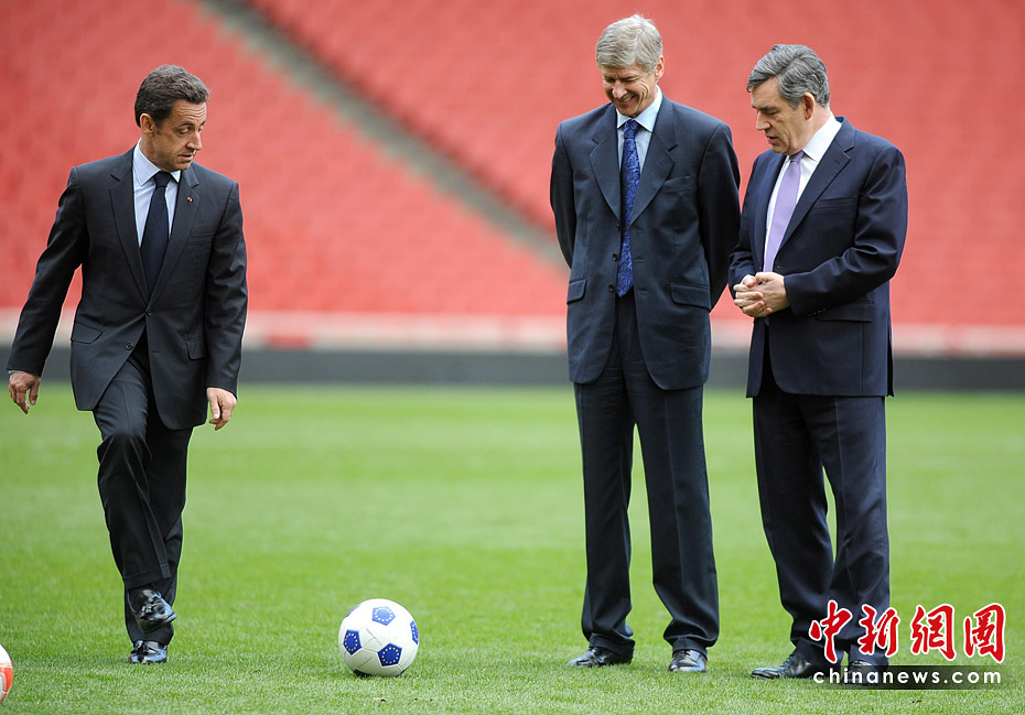 圖為2008年3月27日,法國總統(tǒng)薩科齊來到倫敦酋長球場,在英國首相布朗和英超勁旅阿森納隊主教練溫格面前“秀”了一下腳法。