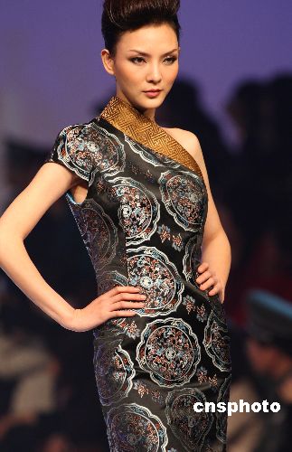 11月7日晚,“人文奧運”中國概念時尚成衣設(shè)計大賽總決賽在北京時尚設(shè)計廣場舉行,共有60組系列作品參加預(yù)評。評委會從中篩選出男、女禮儀正裝各15—20個系列參加總決賽。大賽組委會融合中國時裝設(shè)計界集體智慧,給北京奧組委和公眾展現(xiàn)出既“體現(xiàn)中華文化特征”,又“適應(yīng)現(xiàn)代生活方式”的“禮儀正裝”系列,“將中國概念的傳統(tǒng)文化融入時尚成衣設(shè)計”,旨在借北京2008“人文奧運”契機,弘揚中華文化、發(fā)展原創(chuàng)品牌、展示奧運風采、創(chuàng)新生活時尚。圖為模特展示“人文奧運”概念時尚成衣設(shè)計作品。中新社發(fā) 錢興強 攝