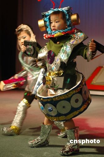 10月30日,安徽省蕪湖市在少年宮舉辦首屆青少年科普運動會環(huán)保時裝秀比賽,來自28所中小學共280名學生參賽。孩子們身著用報紙、包裝袋、塑料瓶、樹葉等廢舊材料制成的時裝,以各種獨特的藝術(shù)造型展現(xiàn)“保護環(huán)境、節(jié)約能源”的環(huán)保理念。中新社發(fā) 陳立希 攝