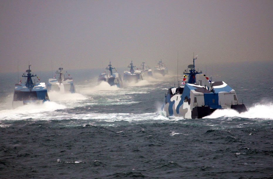 4月23日下午,為紀(jì)念中國(guó)人民解放軍海軍成立60周年而舉行的海上閱兵在青島附近黃海海域舉行。海上檢閱式分兩個(gè)階段,第一階段為海上分列式,檢閱中國(guó)海軍的艦艇和飛機(jī);第二階段為海上閱兵式,檢閱來自14個(gè)國(guó)家的21艘艦艇。圖為中國(guó)海軍新型導(dǎo)彈快艇編隊(duì)接受檢閱。 中新社發(fā) 張雷 攝