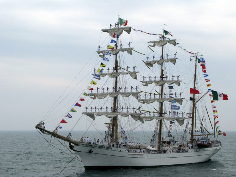 中國歷史上的首次多國海軍檢閱活動四月二十三日下午在青島附近黃海海域舉行。中國國家主席、中央軍委主席胡錦濤乘閱兵艦“石家莊”號導彈驅逐艦,檢閱中國海軍的潛艇、水面艦艇、海軍航空兵和海軍陸戰(zhàn)隊等作戰(zhàn)兵種,并檢閱了來訪的十四個國家的二十一艘艦艇。圖為墨西哥海軍“夸烏特莫克”號風帆訓練艦接受檢閱。中新社發(fā) 中新社發(fā) 琥珀旺旺 攝